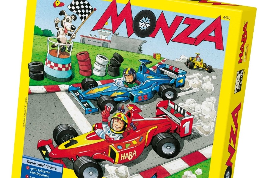 Caratteristiche: Monza è un colorato gioco da tavolo di corse automobilistiche per bambini piccoli. I giocatori lanciano sei dadi e scelgono i colori dai dadi per muovere le loro auto su una pista a tre corsie. Ogni mossa dovrebbe essere scelta con attenzione, abbinando i colori dei dadi agli spazi direttamente davanti a sé e richiede una pianificazione di base. I dadi utilizzati per il movimento vengono messi da parte uno alla volta finché non rimangono più mosse. I giocatori devono rimanere all’interno delle proprie corsie, evitare gli spazi con ostacoli e possono spingere indietro le altre auto se atterrano sulla stessa casella.