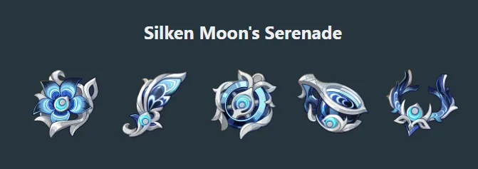 Per Aino, il suo miglior set di artefatti è il Serenata di Silken Moon set, che aumenta la ricarica di energia di Aino per permetterle di usare il suo Elemental Burst più frequentemente e allo stesso tempo garantisce all’intera squadra un potenziamento di maestria elementale quando Aino infligge danni elementali a seconda che la fase lunare sia in Bagliore nascente o Bagliore ascendente (solo 1 personaggio Nod-Krai nella squadra o 2 personaggi Nod-Krai nella squadra). Questo artefatto la aiuta a diventare un forte supporto di Maestria Elementale per la squadra per aumentare il danno della Reazione Elementale Lunare.