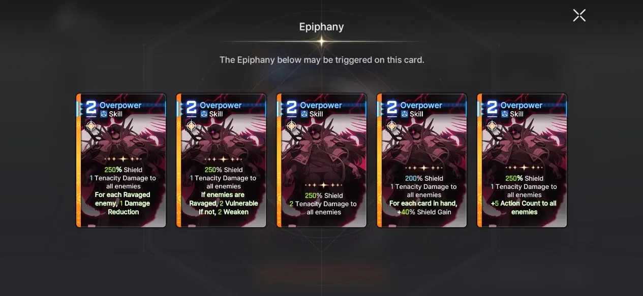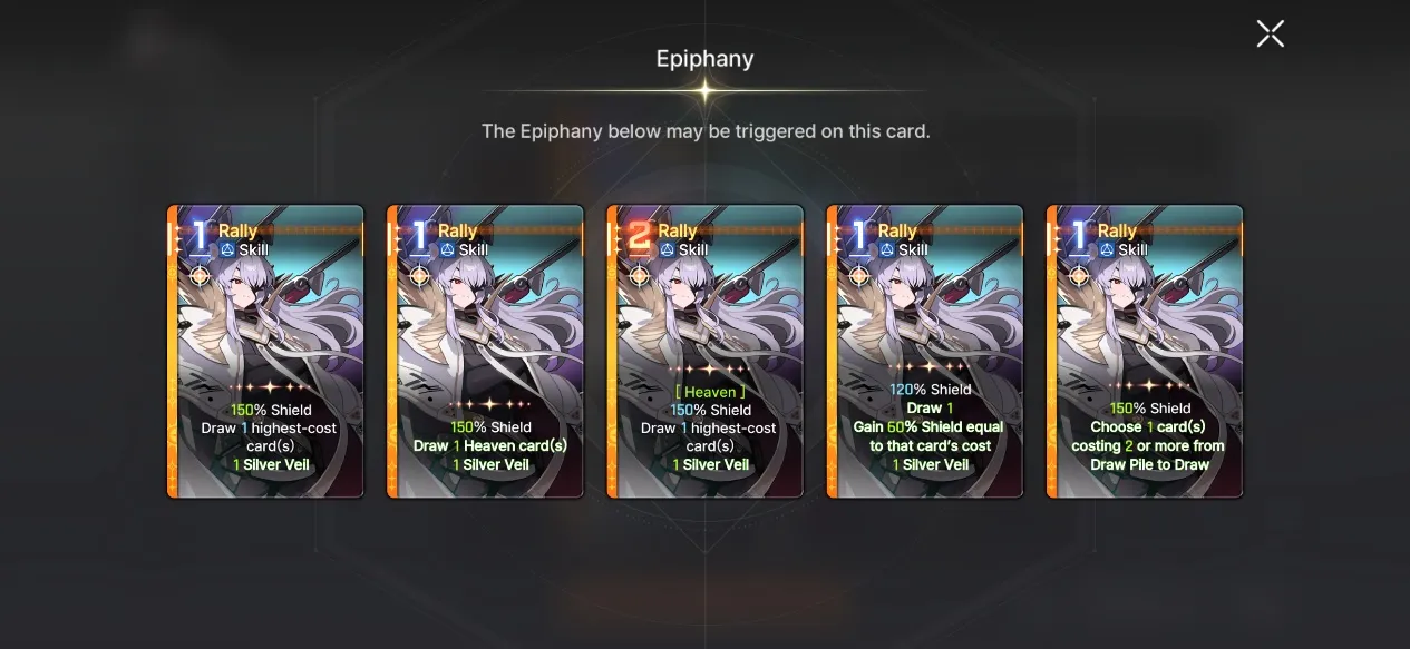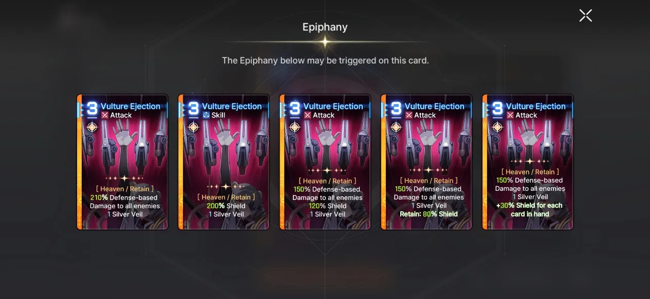 Effetto: Concede uno scudo basato sulla difesa X*100% e garantisce Mantieni tutte le carte in mano per 1 turno.