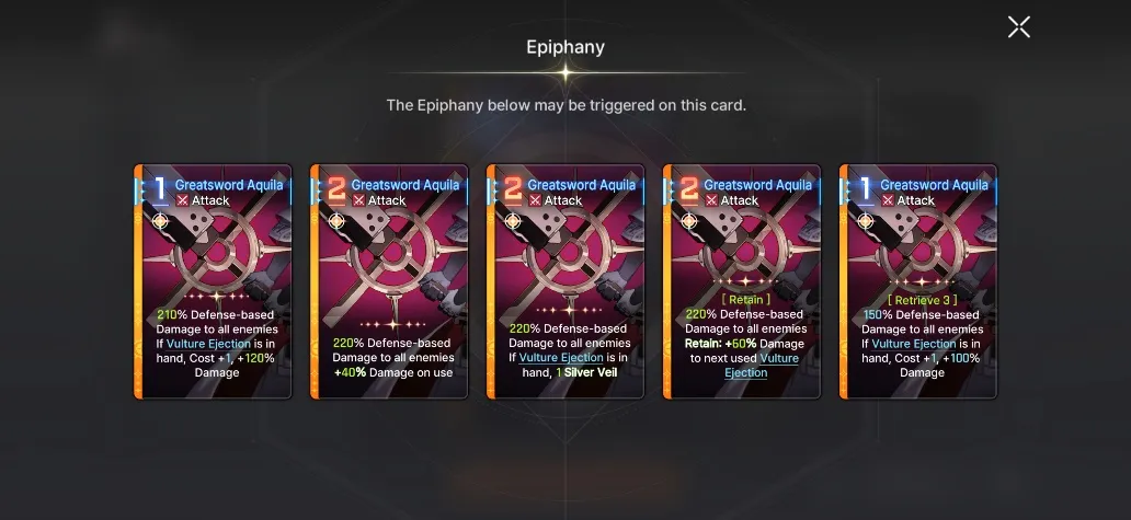 Questa è la meccanica caratteristica di Khalipe. Non è necessario giocare manualmente la carta “Espulsione dell’Avvoltoio” a costo 3. Invece, ogni volta che usi una carta che costa 2 o più AP, attiva automaticamente l’effetto “Espulsione dell’Avvoltoio”, infliggendo danni basati sulla difesa a tutti i nemici e fornendo uno scudo. Ciò rende la sua azione danneggiata incredibilmente fluida, realizzando il ciclo ideale di “difendersi infliggendo danni”.