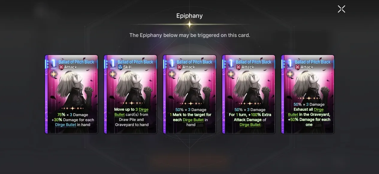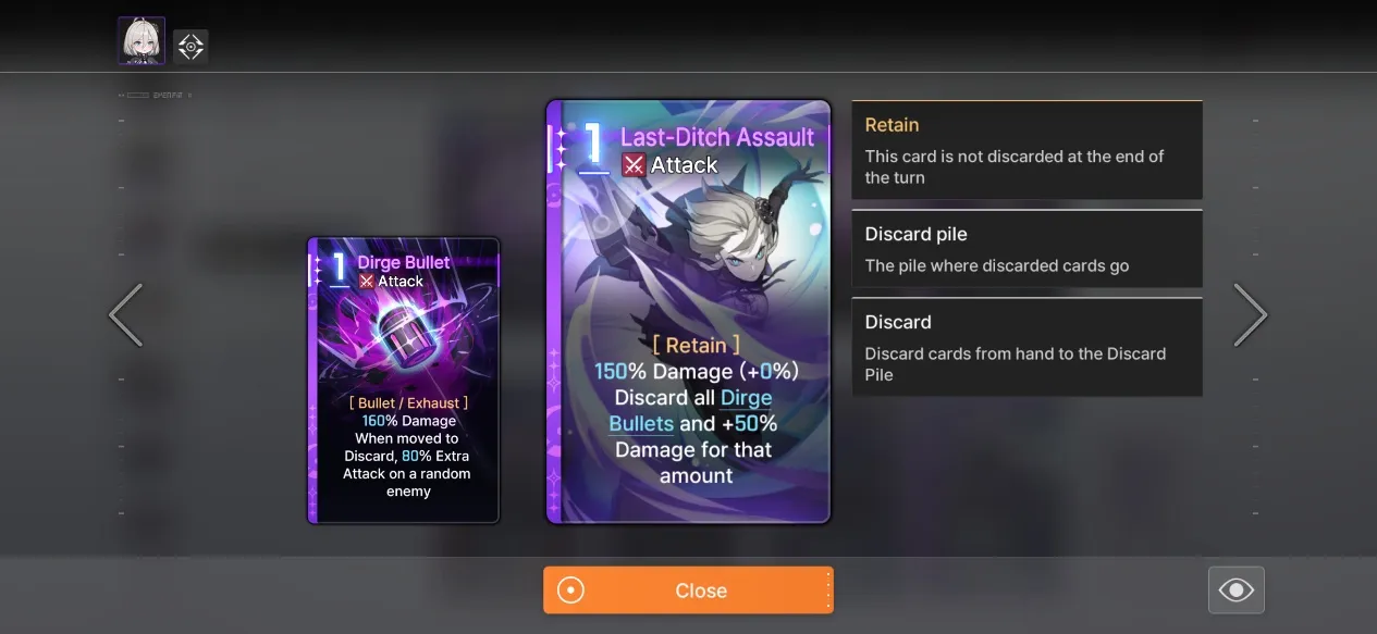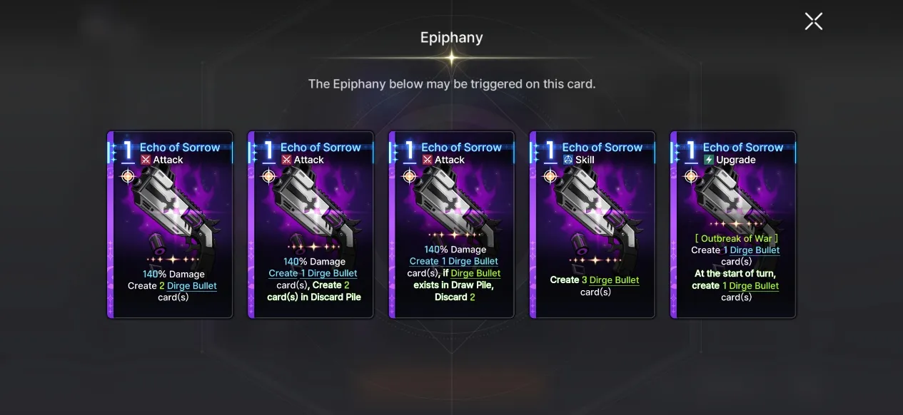 - Assalto disperato: L’asso per porre fine alle battaglie. Questa carta ha il “Conservare” parola chiave, permettendoti di trattenerla per il momento perfetto. Scarta tutti i Dirge Bullets nella tua mano, aumentando significativamente il proprio danno per ognuno di essi scartato. Con proiettili ampi, questo colpo può annientare qualsiasi nemico formidabile.