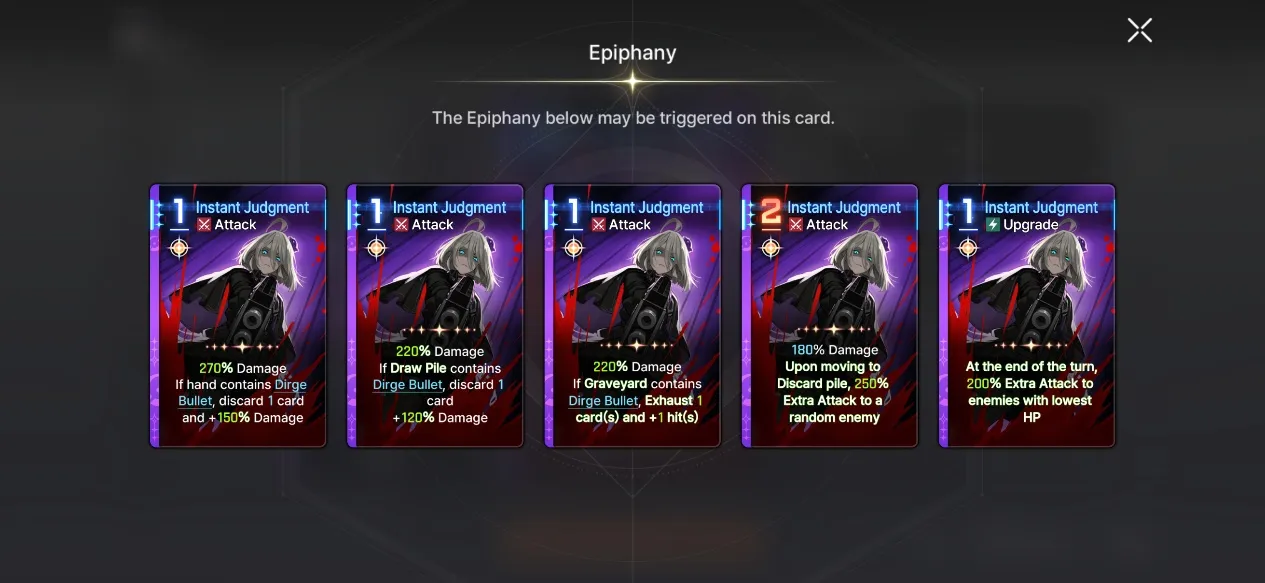 - Giudizio istantaneo: Testata nucleare affidabile a bersaglio singolo. Scartare un proiettile dalla mano infligge istantaneamente danni ingenti e attiva immediatamente l’effetto di scarto del proiettile. Eccellente per eliminare rapidamente e finire i nemici deboli.