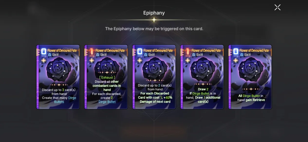 - Fiore del Destino Divorato: Un’abilità incredibile a costo 0. Ti consente di scartare qualsiasi carta dalla tua mano per generare un numero uguale di Dirge Bullets. Può anche scartare i proiettili stessi per crearne di nuovi, consentendo la “rigenerazione dei proiettili” e contemporaneamente attivando il danno da scarto. Questa è la chiave del suo potenziale ciclistico e di combo.