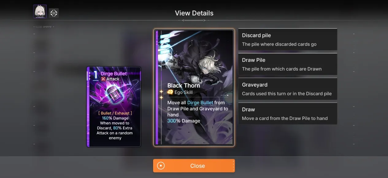 - Giocabilità principale: Generazione e scarto di proiettili. Renoa crea Dirge Bullets attraverso carte specifiche. Questi proiettili possono essere giocati attivamente per infliggere danni elevati o, quando scartati, attivano automaticamente un “Attacco Extra” che colpisce un nemico casuale.