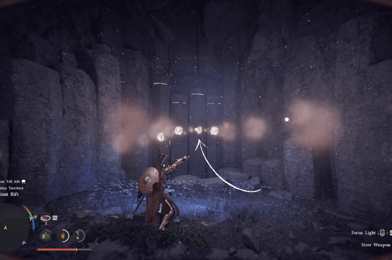 Dopo aver raggiunto la porta, usa Mettere a fuoco la luce sul Primo pilastro a sinistra e tenerlo premuto per alcuni secondi. Come prima, premi il pulsante grande all’interno per ottenere il Pietra incisa.