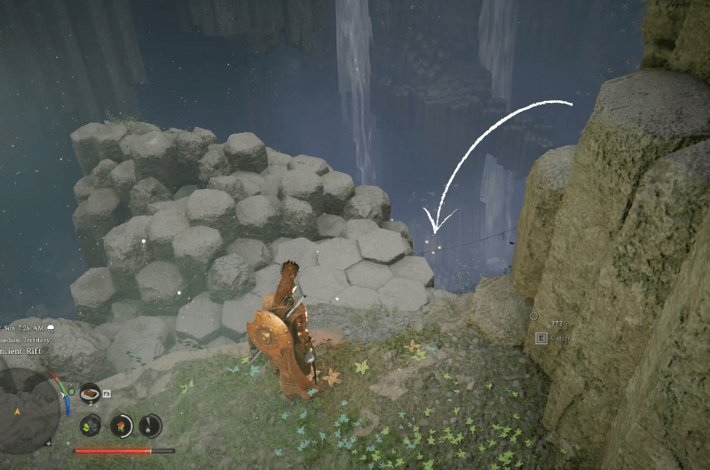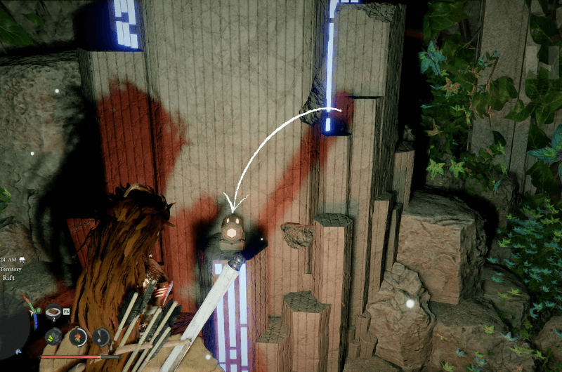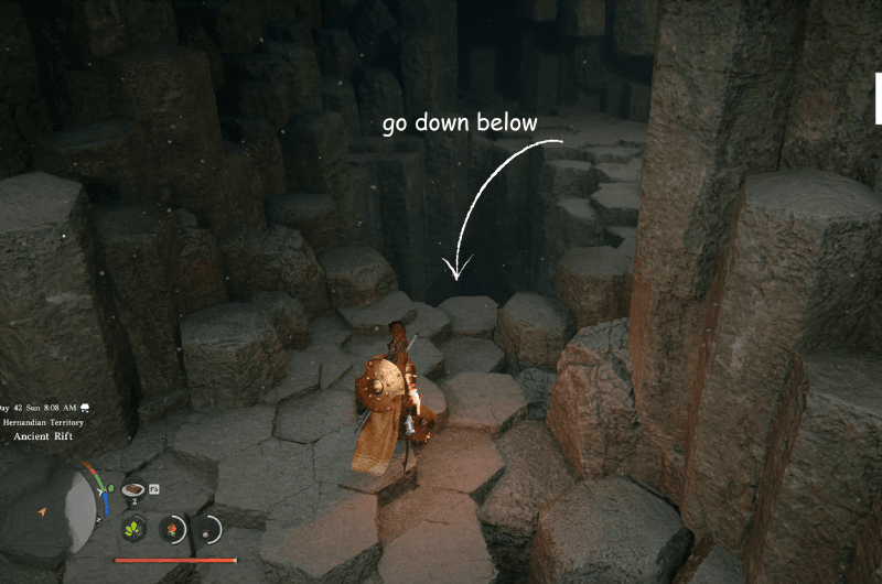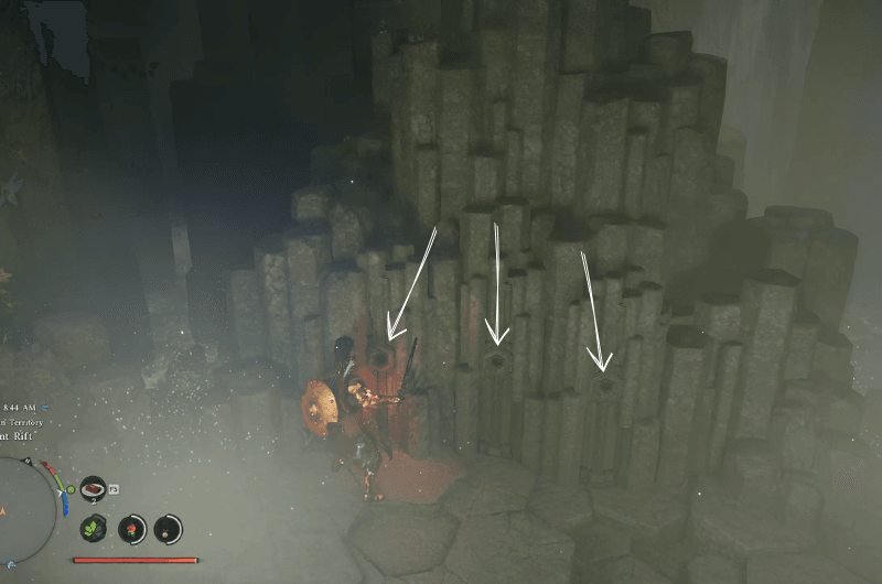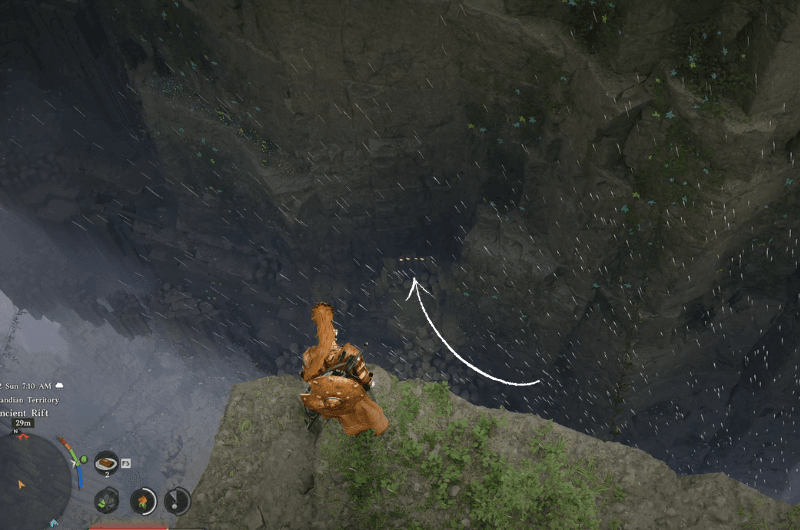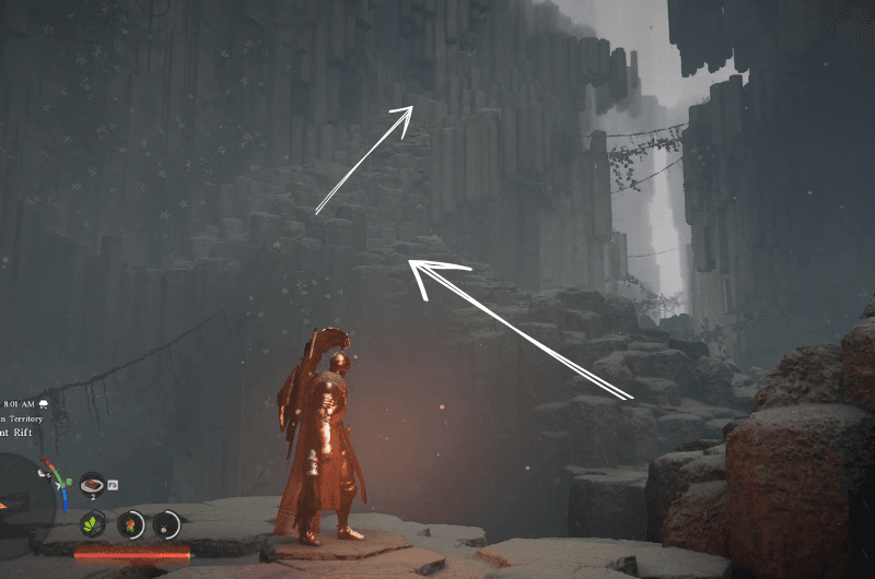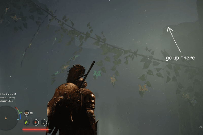 Dopodiché, se ti guardi intorno dovresti essere in grado di vedere a sentiero che porta su. Ho segnato il percorso nell’immagine sopra in caso di confusione. Salite seguendo il sentiero segnalato, arriverete al luogo dove c’è un grande buco nel terra.