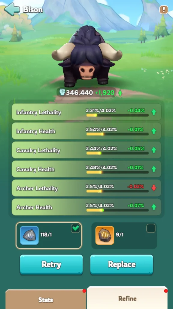 - Gli animali più rari piacciono Rinoceronte gigante E Possente bisonte ottieni migliori aumenti generali delle statistiche attraverso il perfezionamento, quindi dai la priorità a perfezionarli prima se li hai.