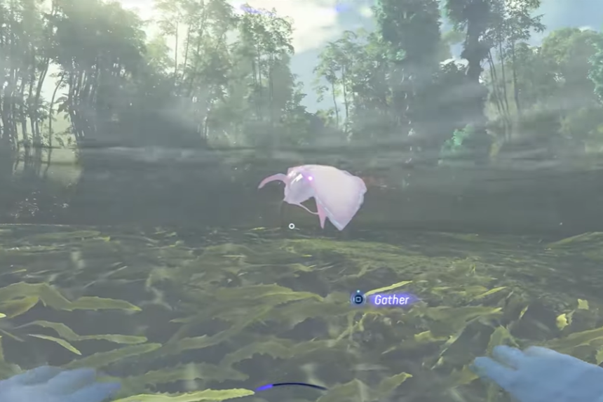 Per iniziare a pescare, devi prima trovare un posto dove pescare. Questi sono solitamente in laghi o altre aree acquatiche. Quando ti avvicini, usa i sensi Na’vi per controllare se ci sono pesci lì. Una volta trovato un punto con i pesci, non è necessario mirare a ciascun pesce uno per uno. Cerca invece l’acqua che bolle o schizza; questo mostra il punto esatto di pesca. Mira a quell’acqua gorgogliante.