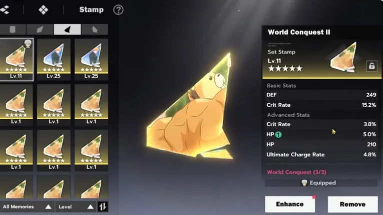 Il set di timbri World Conquest è la scelta migliore in assoluto per Toshiro. L’effetto da 2 pezzi garantisce +11% di danno spirituale, mentre il bonus da 3 pezzi aumenta il danno finale del 30% e aumenta il danno dell’attacco base del 36% per 8 secondi dopo aver usato una tecnica. Questo set si adatta perfettamente al profilo di danno di Toshiro, potenziando la sua esplosione finale Bankai esplosiva e supportando anche il suo danno da attacco base sostenuto in Tensō Jūrin.