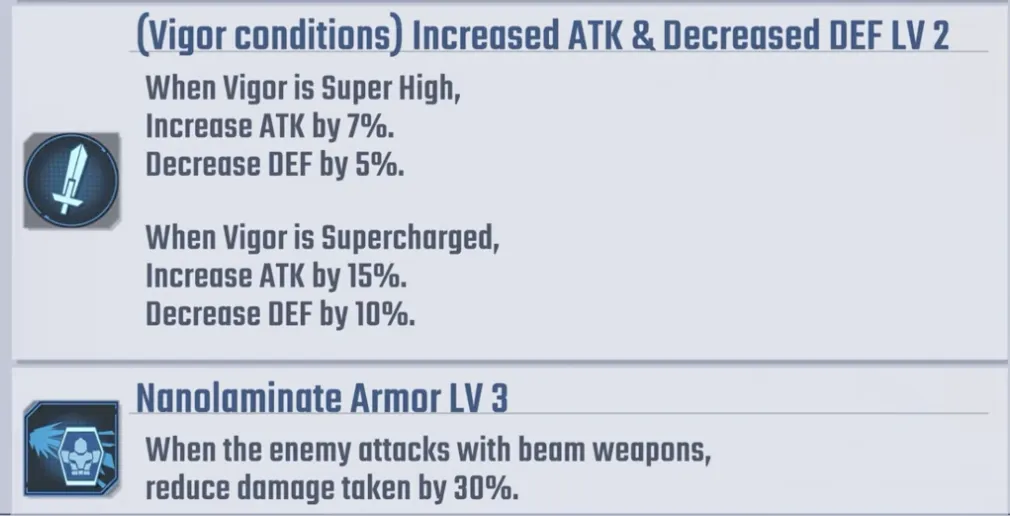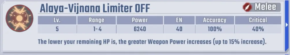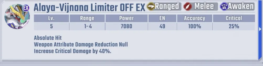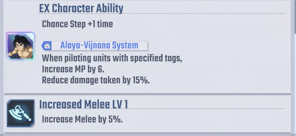 In particolare, la sua abilità EX gli garantisce una tripla azione incondizionata. Quando pilota un’unità con il sistema Alaya-Vijnana, ottiene anche +6 MP e il 15% di riduzione del danno personale.