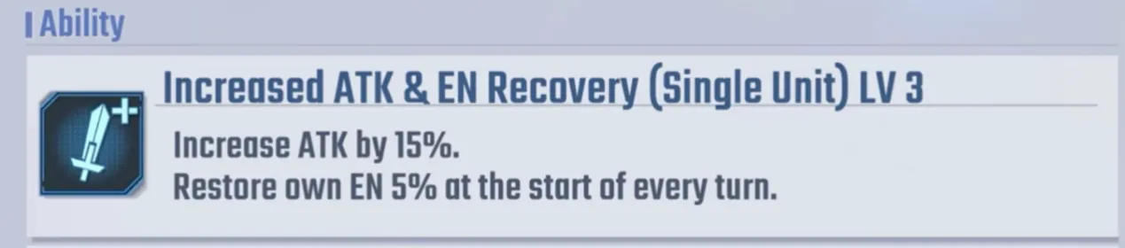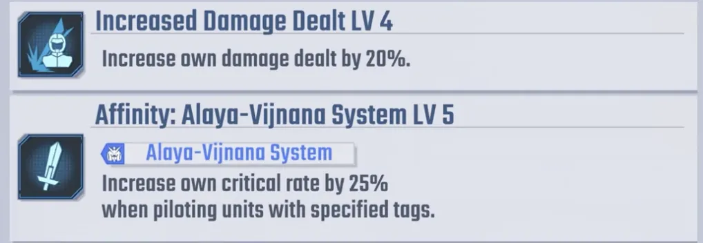 Le sue abilità includono un aumento del danno del 20%, un aumento del tasso critico del 25% e bonus speciali quando pilota unità con il sistema Alaya-Vijnana.
