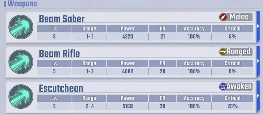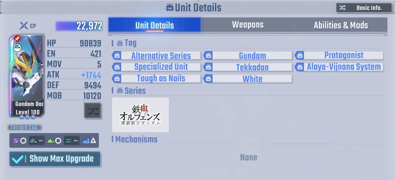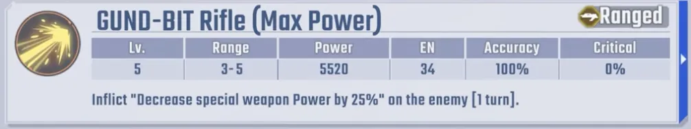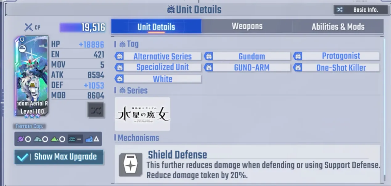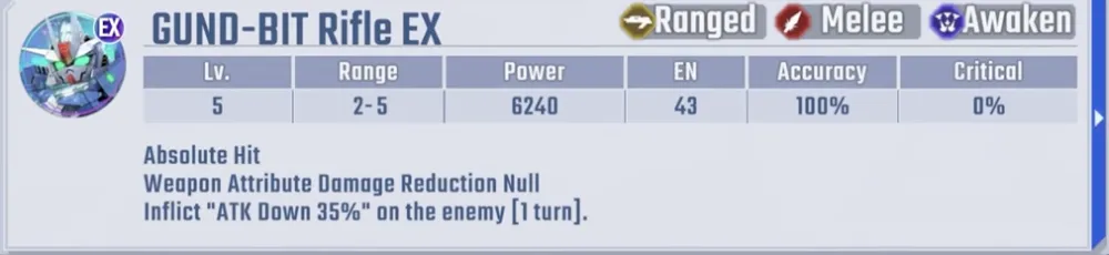 L’unità ha Mobilità 5, un costo EX di 57, Portata 1-4 e Potenza 7080, che è alla pari con lo Zeta Gundam, soddisfacendo lo standard per le unità limitate.