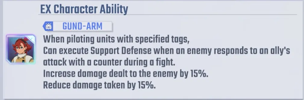 La sua abilità EX è davvero unica: quando pilota un’unità con il tag GUND-ARM, può eseguire la difesa di supporto quando l’attacco di un alleato viene contrattaccato da un nemico.