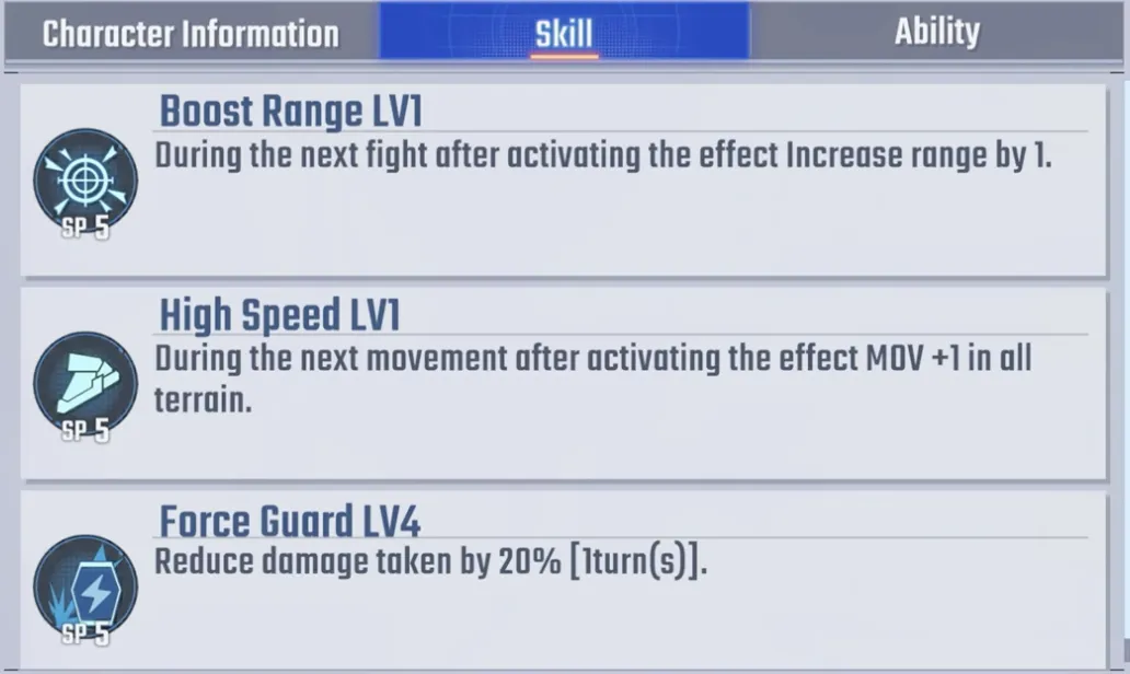 Il suo set di abilità include: tasso critico +50%, corpo a corpo +25% e un’abilità SP10 “Evasione”.