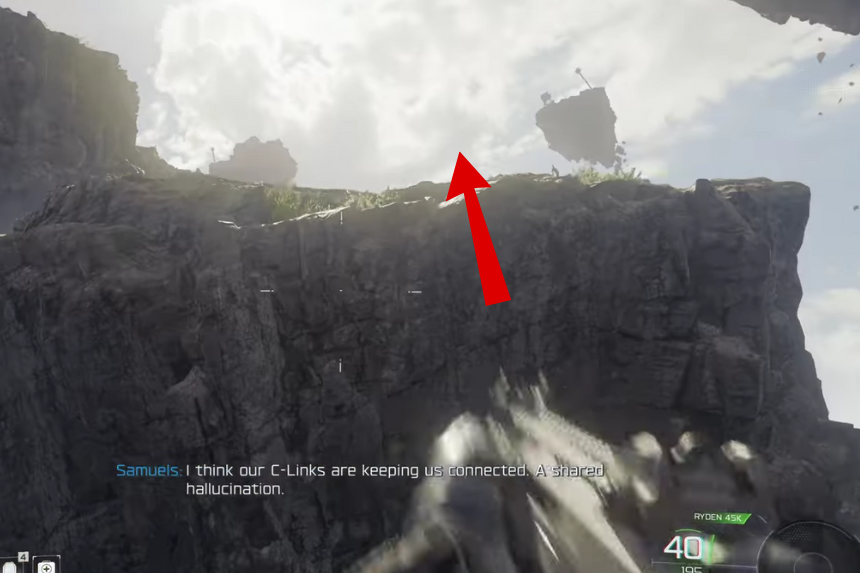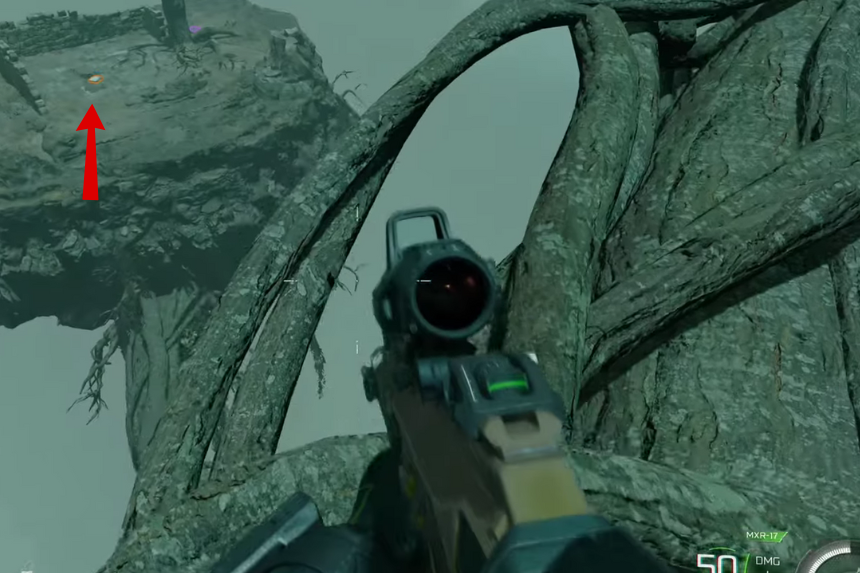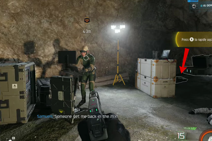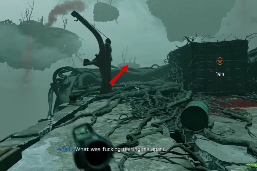 Man mano che l’acqua si alza durante questa missione, raggiungerai la cima di un pozzo e aprirai una porta che conduce all’esterno. Il tuo obiettivo principale è salvare Woods da un container, ma non interagire ancora con il container. Invece, vai dietro. Puoi aggrapparti o fare un salto complicato per raggiungere la sporgenza sotto di te. Salta sui rampicanti sul lato e guarda verso una piccola isola galleggiante.