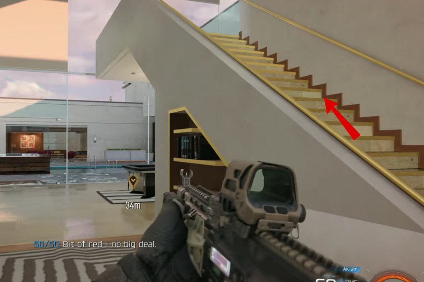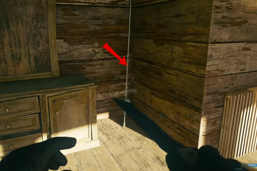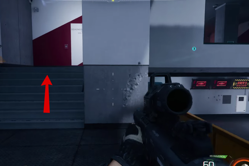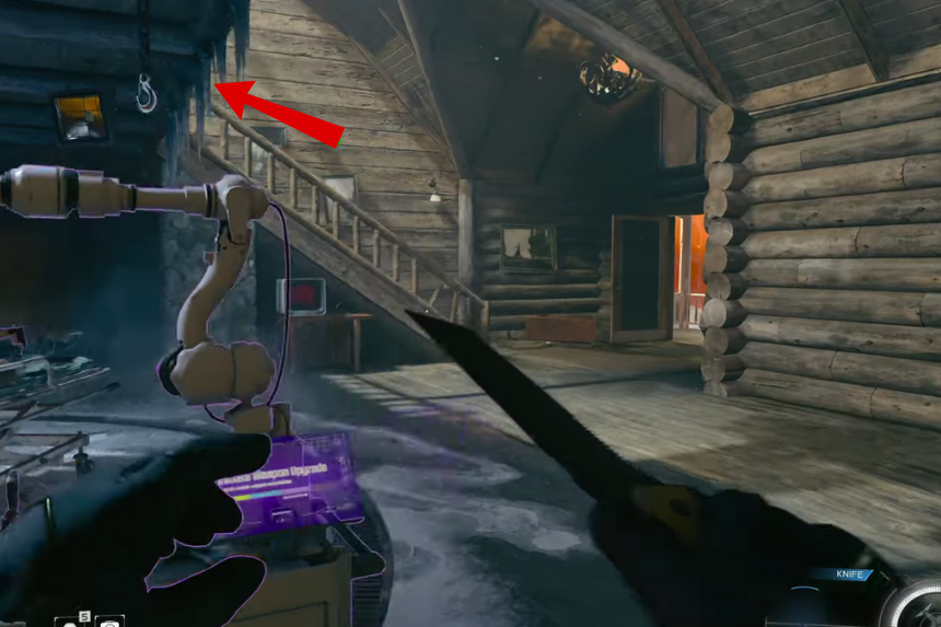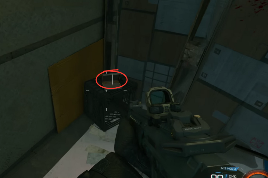 Dopo aver attraversato la nebbia rossa all’esterno, entrerai in una cabina contenente la tua prima postazione di lavoro viola. Trascorrerai un po’ di tempo a difendere questo edificio, ma prima di andartene, entra, sali le scale e gira a destra nella stanza laterale. Girate ancora a destra e guardate verso il semplice cassettone di legno.