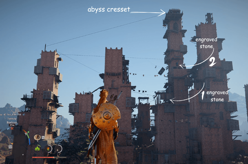 Consiglierei di ottenere il Nesso dell’Abisso vicino al Burhum città prima di procedere. Quindi, devi raccogliere 3 pietre incise tra le quali puoi trovare il 2 di loro all’interno del edificio più alto in cima al quale il Cresset dell’Abisso bugie e puoi trovare la terza pietra nella sezione inferiore del limitrofo edificio.