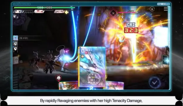Nel combattimento reale, Sereniel eccelle nel distruggere rapidamente i nemici attraverso i danni di Tenacia. Alcuni effetti sui colpi vengono convertiti in “Cubi spettrali”, che possono essere scambiati con costellazioni di personaggi e vari materiali di progressione. Devastando rapidamente i nemici con il suo elevato danno tenacia, riporterà la sua carta “Laser a ricerca” nella tua mano per riutilizzarla, permettendole di scatenare una raffica costante di attacchi.
