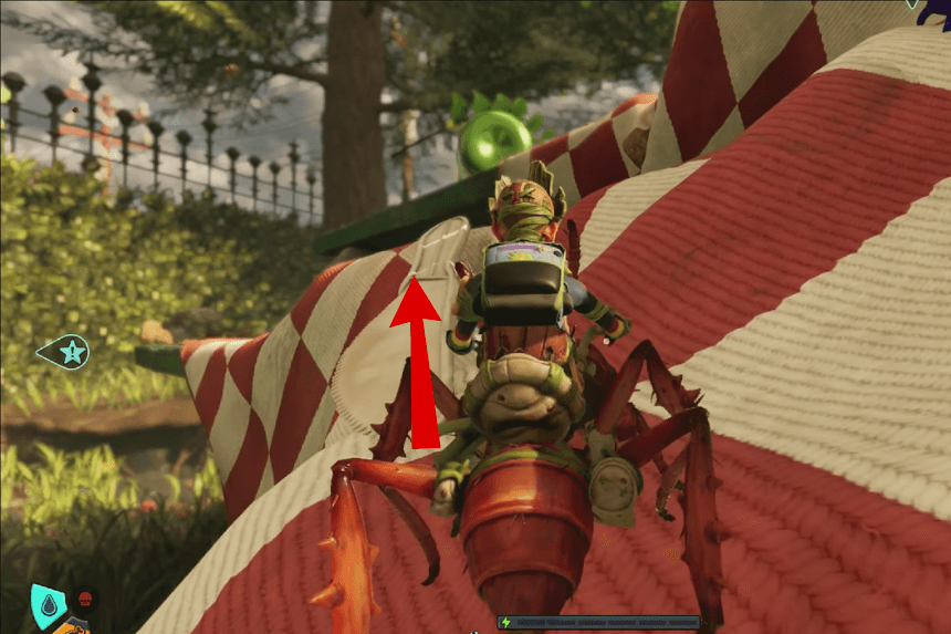 Per prima cosa, vai al tavolo da picnic sulla tua mappa. Potrai salire lungo il lato utilizzando la tovaglia sospesa. Sali lentamente; noterai che puoi camminare sotto la tovaglia a circa metà altezza. Da lì, cerca un grosso maglio di legno che giace sul bordo. Puoi attraversarlo per continuare la tua salita.