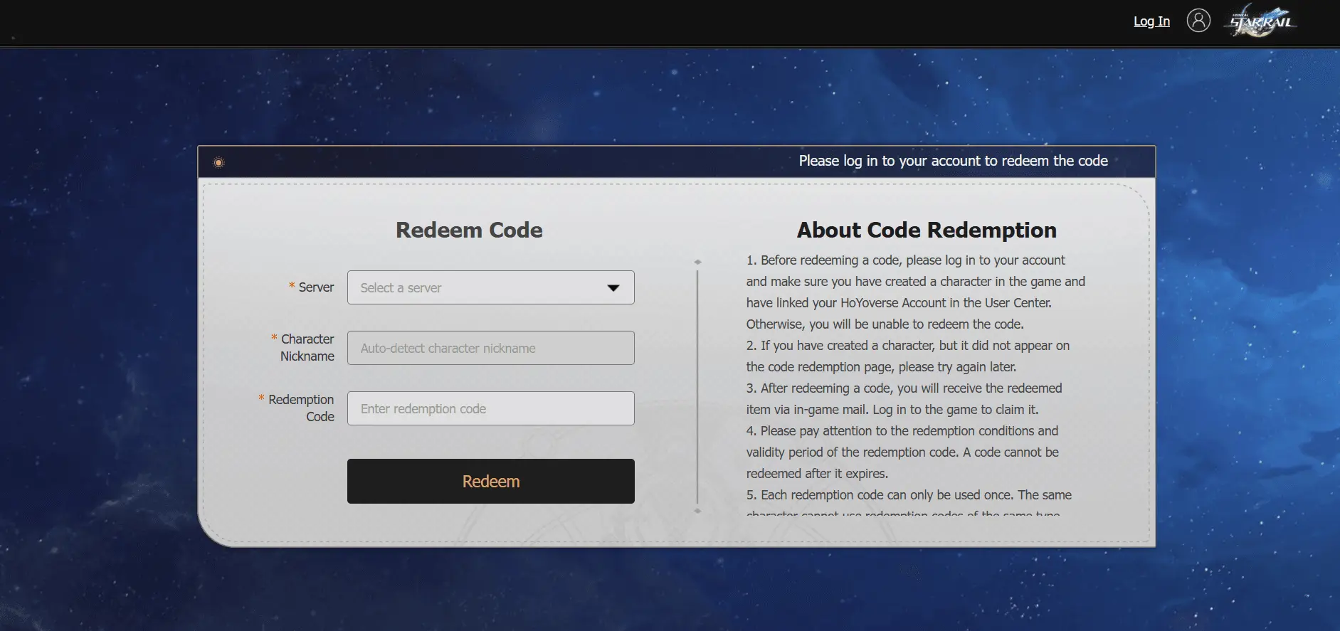 Visita il sito web ufficiale di riscatto di HoYoverse e accedi al tuo account. Seleziona il nome del tuo server e del tuo personaggio dal menu a discesa. Questo passaggio fa inciampare i giocatori che dimenticano su quale server si trovano, quindi ricontrolla prima di procedere. Incolla il tuo codice nella casella di riscatto e fai clic su Riscatta. Controlla la tua casella di posta nel gioco per richiedere la merce.