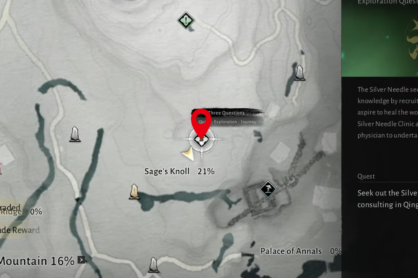 Per completare la parte delle “tre domande” della missione, devi prima cercare il discepolo dell’ago d’argento. Una volta arrivato nel luogo segnato, il discepolo non sarà lì presente; piuttosto, l’apprendista sarà presente al suo posto. Parla con l’apprendista e ti darà alcuni indizi utili su come rintracciare il vero Discepolo dell’Ago d’Argento.