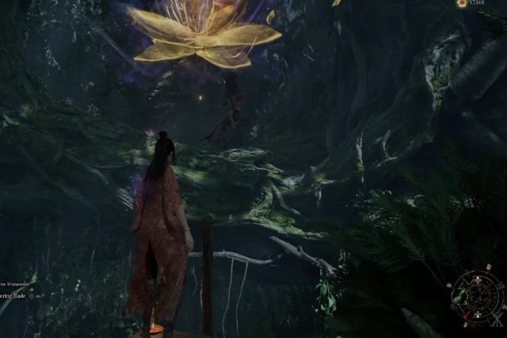 Continua a seguire il percorso finché non raggiungi un punto in cui un nemico normale sorveglia una scala, mentre un Evocatore di Loto lancia incantesimi a distanza.