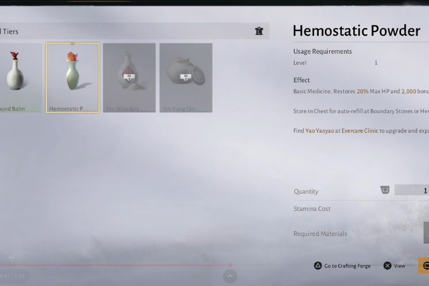 Se sei in possesso della polvere emostatica nel tuo inventario, sarai in grado di completare la missione in pochissimo tempo. Tuttavia, se non lo possiedi, puoi crearlo aprendo la borsa, scegliendo l’opzione di creazione e poi andando a Brew Medicine.