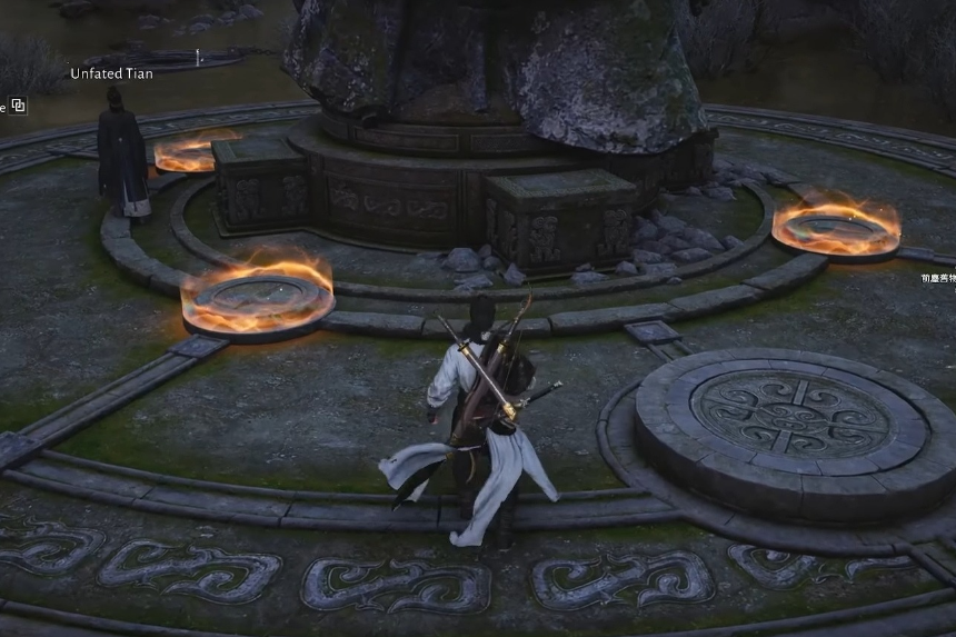 Dopo aver prosciugato l’acqua, scendete ed entrate nel fondo del pozzo vuoto, poi dirigetevi a sinistra verso la grande statua di una donna con gli occhi coperti da una benda. Quando ti avvicini alla statua, parla di nuovo con lo zio Tian. Attiverai una serie di piastre del pavimento che si trovano vicino alla statua.