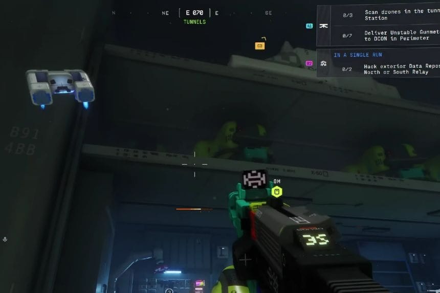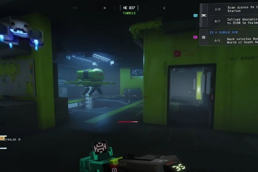 Per continuare con la parte 3 di Distribuzione equa in Marathon, devi scansionare tre droni. Per fare questo, devi andare nell’area dei tunnel. Una volta che sei nel tunnel, devi cercare le porte laterali. Nella parte superiore di ciascuna porta laterale, vedrai un cartello con su scritto “Drone Station” o “Drone STN”. Una volta che vedi uno di questi segnali, devi attraversare la porta laterale, seguendo il corridoio verde all’interno. Se continui ad attraversare questo corridoio verde, entrerai in un’area garage. Qui è dove puoi trovare i droni.