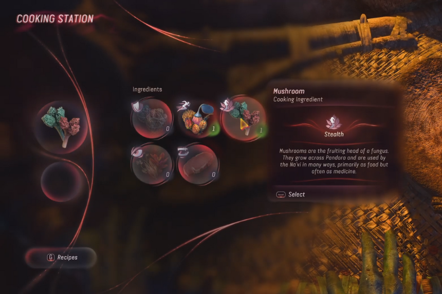 Una volta raccolti oggetti come carne, frutta o funghi, puoi portarli in una stazione di cottura per preparare il cibo. Sei libero di mescolare due ingredienti qualsiasi e combinazioni diverse ti daranno aumenti delle statistiche diversi. Non è necessario trovare prima le ricette; si sbloccano naturalmente mentre sperimenti e provi nuovi mix. Puoi portare nella borsa solo sette pasti cucinati alla volta, quindi scegli attentamente. Prima di iniziare un combattimento, assicurati di portare con te i piatti che ti danno i potenziamenti di cui avrai più bisogno.