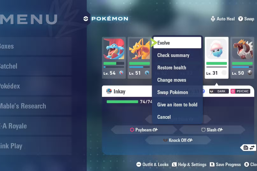 - L’opzione “Evolvi” dovrebbe ora essere disponibile: premila per far evolvere Inkay in Malamar.