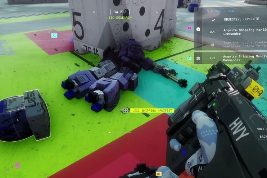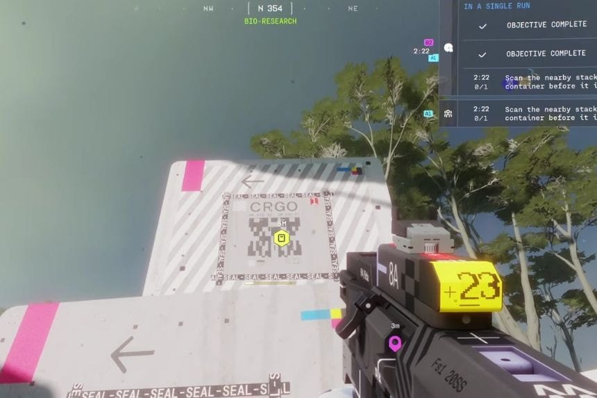 Ora otterrai un obiettivo a tempo, di solito circa 2 – 3 minuti per completarlo. Scansiona i contenitori di spedizione contrassegnati. All’inizio potrebbero non essere contrassegnati chiaramente, ma man mano che ti avvicini vedrai gli indicatori. A volte puoi scansionarli da terra se appare l’icona. Una volta scansionati tutti i contenitori, tutti e tre i passaggi saranno completati e la taglia terminerà.