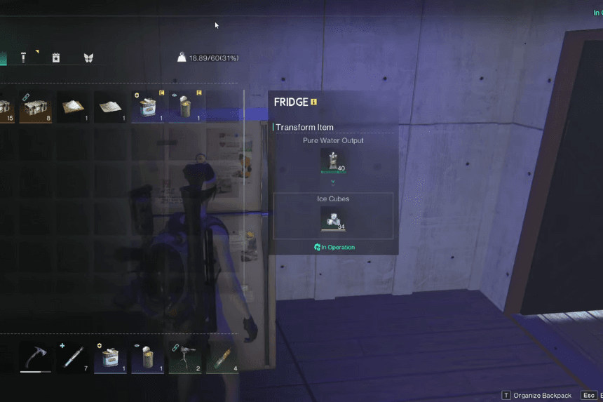 Per creare un cubetto di ghiaccio, premi “G”, quindi fai clic su Acqua purificata per convertirlo in cubetti di ghiaccio. Usa il tasto destro del mouse per prelevare dal frigorifero la quantità di ghiaccio di cui hai bisogno.