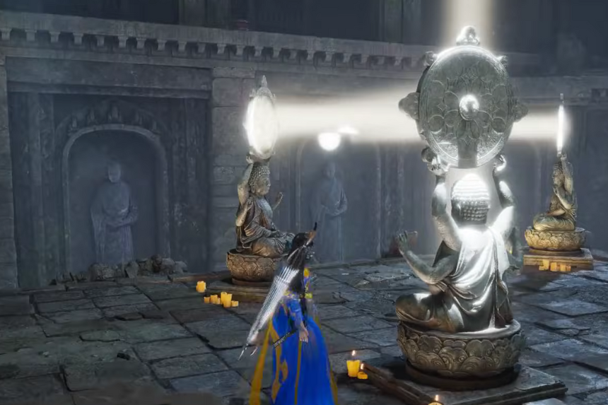 In basso, attiva il punto di viaggio rapido, quindi ruota la statua finale usando Meridian Touch per puntare la luce verso la porta di uscita. Oltre questa porta c’è un boss segreto, uno dei combattimenti più difficili all’inizio del gioco. Ma sconfiggere questo boss sblocca solo Yaksha Rush, non Free Morph.