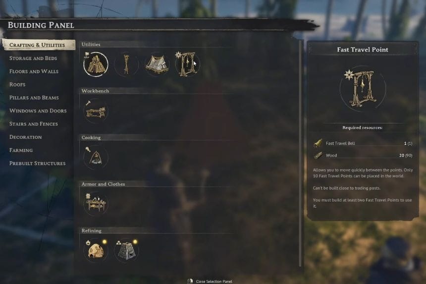 Una volta ottenuto il progetto, apri il menu di costruzione (premi B), vai su Creazione > Utilità e sarai in grado di creare il punto di viaggio rapido. Per realizzarlo avrai bisogno di 10 lingotti di rame e 3 corde. Puoi realizzarli su un banco da lavoro. I lingotti di rame provengono dal minerale di rame trovato nelle caverne e la corda è realizzata utilizzando fibre vegetali.