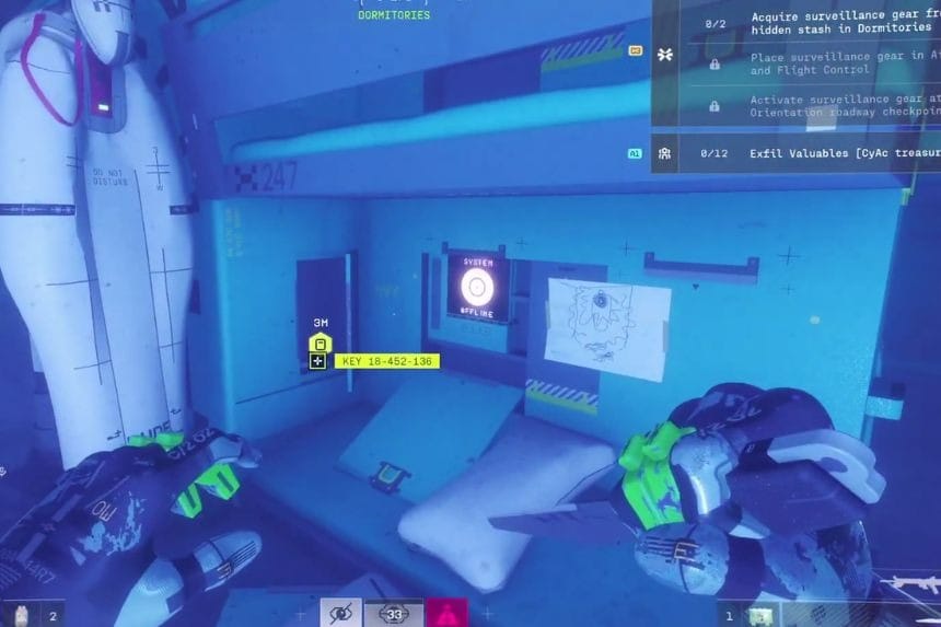 Una volta che hai la chiave, vai ai dormitori e usa la chiave per sbloccare la scorta nascosta. Ora puoi raccogliere l’equipaggiamento di sorveglianza dalla scorta nascosta nei dormitori. Devi completare l’intero obiettivo in una sola corsa senza essere ucciso dai nemici.