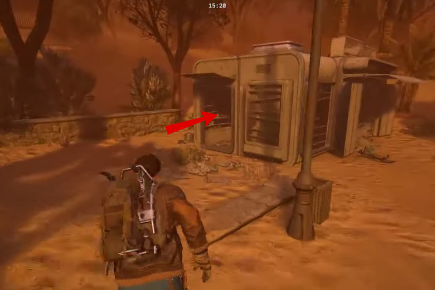 Andate verso il magazzino e salite in cima. Usate la scala per raggiungere il tetto. Quindi vai avanti e raggiungerai il lato posteriore dell’edificio. Tra le macchine troverai il terzo pulsante rosso.
