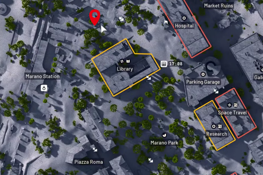 Vai alla posizione segnata sulla mappa sopra. Qui troverai un edificio sotterraneo. Usa la zipline per scendere e raggiungere l’area sotterranea. Vai avanti, quindi gira a sinistra e troverai il secondo pulsante vicino agli scaffali.