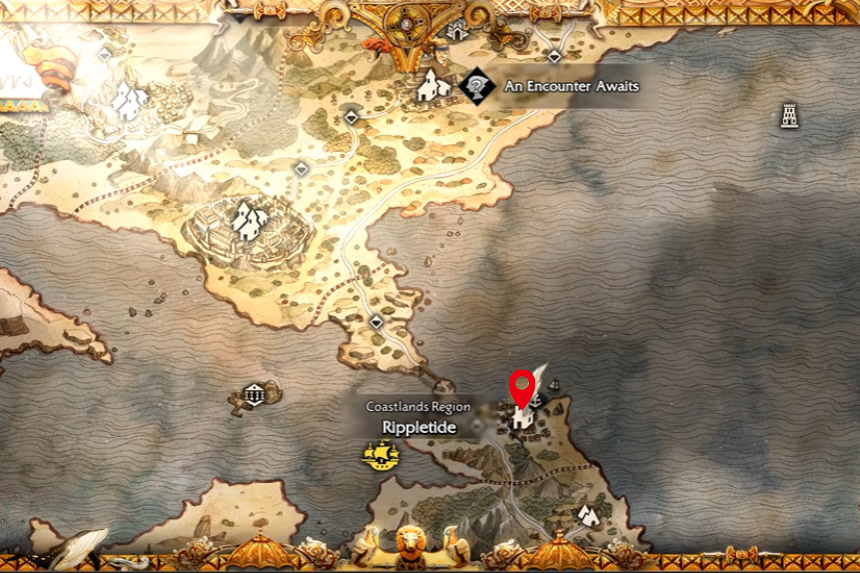 Per prendere la nave, dirigiti verso Rippletide. Devi essere al livello 20 per arrivarci in sicurezza. Una volta arrivato lì, vai al molo e parla con Marjim. Usa l’azione Richiedi percorso su di lui per attivare una scena. Successivamente, il gioco ti dà la possibilità di pagare 80.000 foglie per saltare avanti.