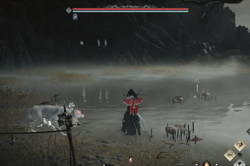 - Quando entrerai nella sua tana, vedrai la Fanciulla Lupo su un albero, e i suoi lupi ululeranno per segnalare l’inizio del combattimento. Balzeranno immediatamente giù e ti caricheranno. La loro mossa principale è un attacco in salto veloce, che puoi parare per eliminarli rapidamente.