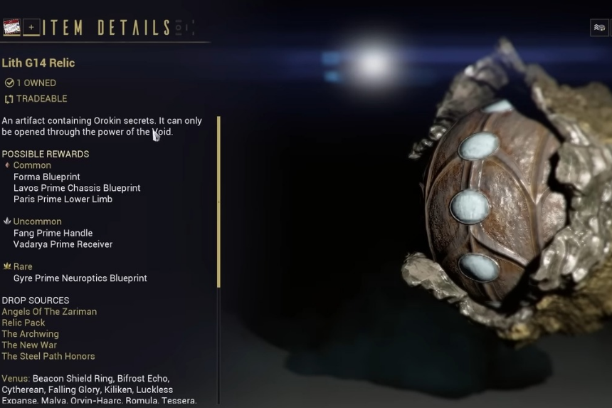 Le reliquie per Gyre Prime non richiedono troppa macinazione, poiché c’è solo una parte rara nell’intero set. Quando ti concentri sull’acquisizione di reliquie Lith G14, prova ad aprirle in squadre coordinate quando possibile, e il resto della build di solito si riunisce senza troppi problemi.