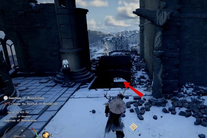 All’interno dell’edificio puoi anche trovare lo scrigno del tesoro per il Santuario della Benedizione. Lo scrigno del tesoro si trova alla fine della stanza ed è ricoperto di rampicanti. Apri lo scrigno del tesoro per ottenere l’Elmo di cuoio del Regno Caduto.