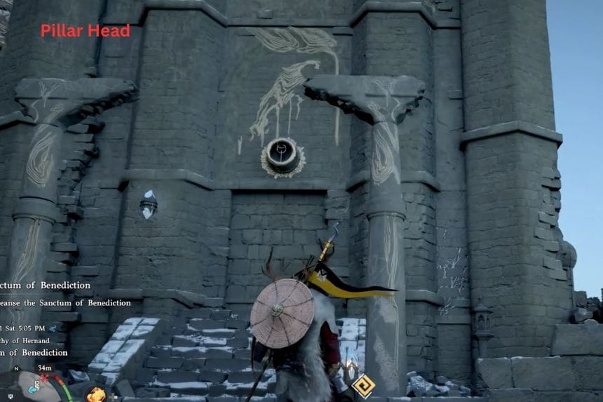 Quando sei all’interno dell’edificio, guarda alla tua sinistra. Vedrai il pezzo mancante del pilastro del Santuario della Benedizione. Usa la mano Axiom sul pezzo per estrarlo. Potrebbe essere necessario girarlo leggermente mentre lo estrai. Riporta il pezzo in cima al pilastro vicino al puzzle nel Santuario della Benedizione. Quando ti avvicinerai, andrà nella direzione. Metti con attenzione il pezzo sopra il pilastro.