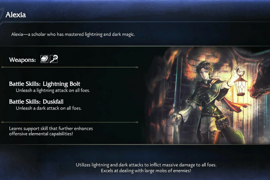 Alexia è una studiosa che studia la magia delle antiche civiltà. Al momento è bloccata nelle sue ricerche, ma crede che unirsi al protagonista potrebbe aiutarla a scoprire qualcosa di nuovo. Alexia è una giovane donna con i capelli corti castani. Indossa un cappotto verde e un mantello sopra una camicia bianca con maniche a sbuffo, insieme a alti stivali di pelle che le arrivano sopra le ginocchia.