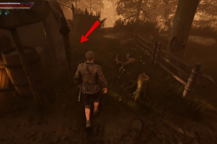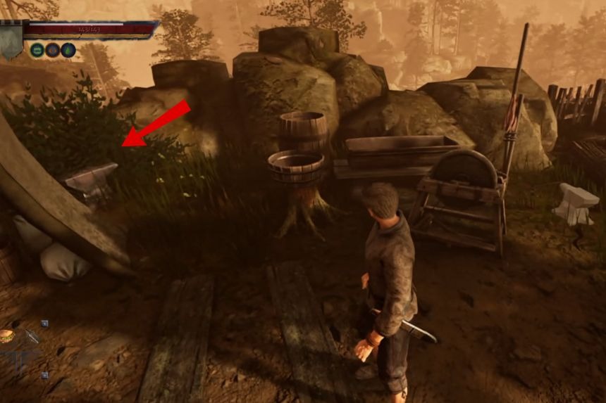 Successivamente, vai verso la ruota per affilare e proprio dietro di essa troverai l’incudine, nascosta tra i cespugli. Raccoglilo e posizionalo nel punto evidenziato. Devi posizionare l’incudine nel punto evidenziato altrimenti Cyril non sarà lì per costruire la spada di Beltran per te.