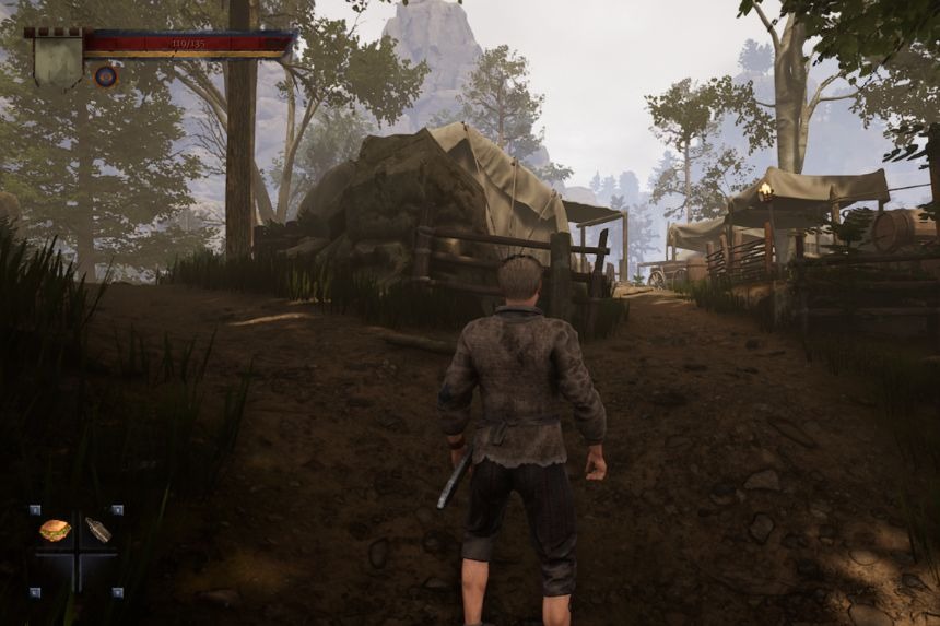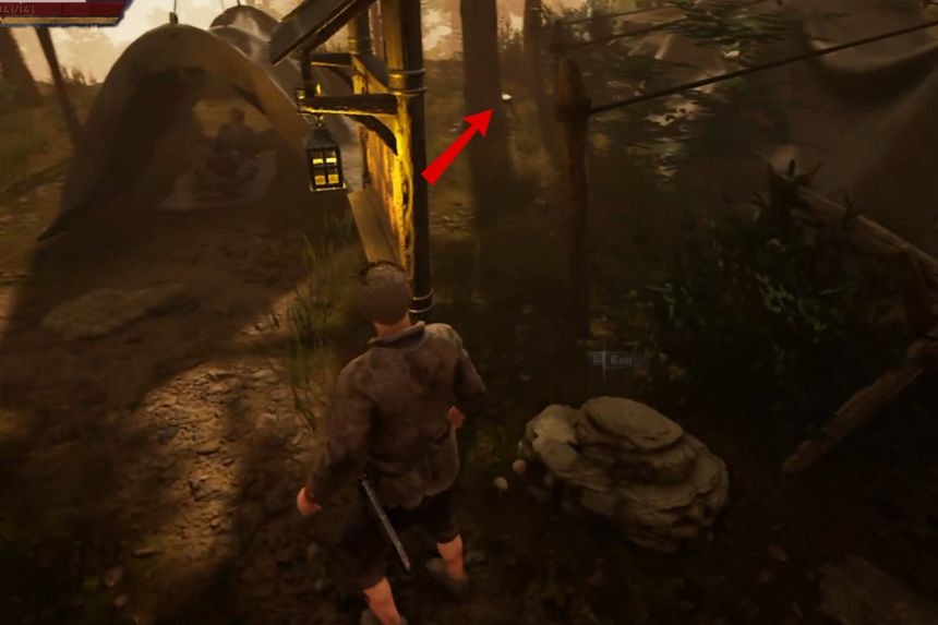 Quindi dirigiti verso l’altro lato dell’accampamento e troverai un’altra incudine. Proprio a sinistra, dietro un albero c’è il martello di Cyril. Poiché il martello si trova tra i cespugli, vicino all’albero, puoi facilmente non vederlo se non guardi attentamente.