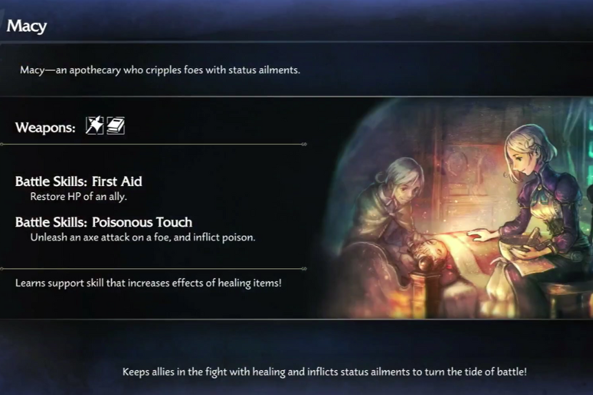 Reclutare Macy in Octopath Traveler 0 è un ottimo modo per aggiungere un guaritore al tuo gruppo. È una farmacista con una personalità cordiale e una forte dedizione all’aiuto dei malati. La sua missione è breve e facile da seguire e, una volta che l’aiuterai a prendersi cura di un bambino malato a Emberglow, si unirà alla tua squadra di avventure.