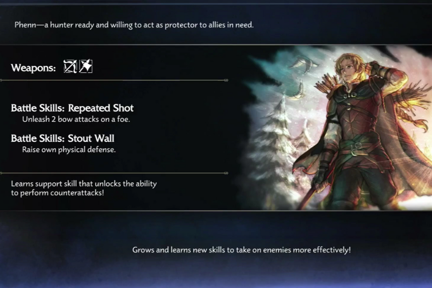 Phenn è uno dei primi personaggi che puoi reclutare in Octopath Traveller 0 e includendolo nel tuo gruppo otterrai un cacciatore forte e affidabile fin dall’inizio. È un volto familiare a Wishvale e gioca un ruolo importante nel suo restauro. Se hai appena iniziato il tuo viaggio e desideri un potente attaccante fisico in grado di gestire sia il combattimento a distanza ravvicinata che a lungo raggio, Phenn è un ottimo compagno da imparare presto.