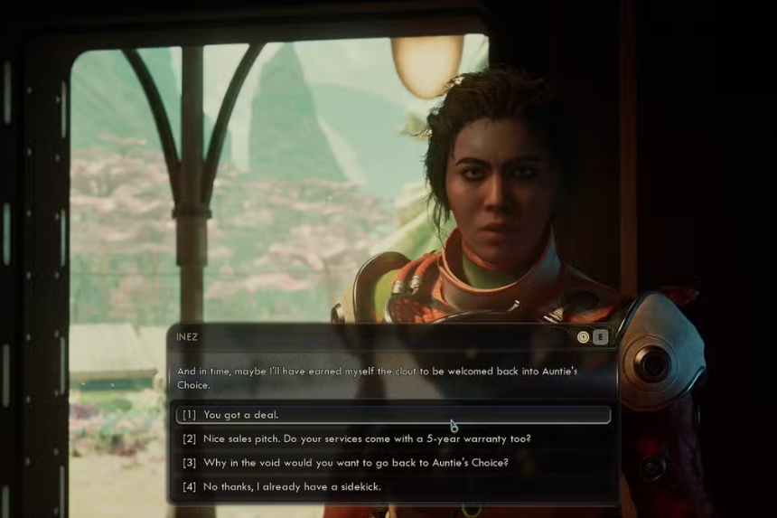 Dopo aver completato il tuo obiettivo principale nell’area, torna all’insediamento principale: troverai Inez che negozia il suo contratto con il ministro Milverstreet. Una volta che la scena si è conclusa, parlale di nuovo e lei accetterà di unirsi al tuo equipaggio.
