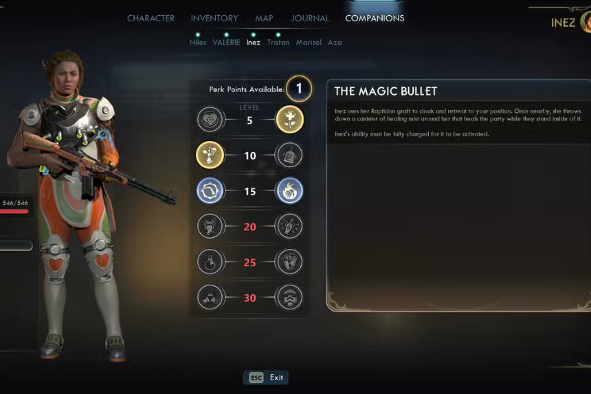 Inizialmente, l’abilità del compagno di Inez non sarà sbloccata. Per raggiungere questo obiettivo, dovrai completare la missione del suo compagno, che consiste nell’aiutarla a riparare il suo braccio cibernetico. Il risultato della missione trasforma la sua abilità: